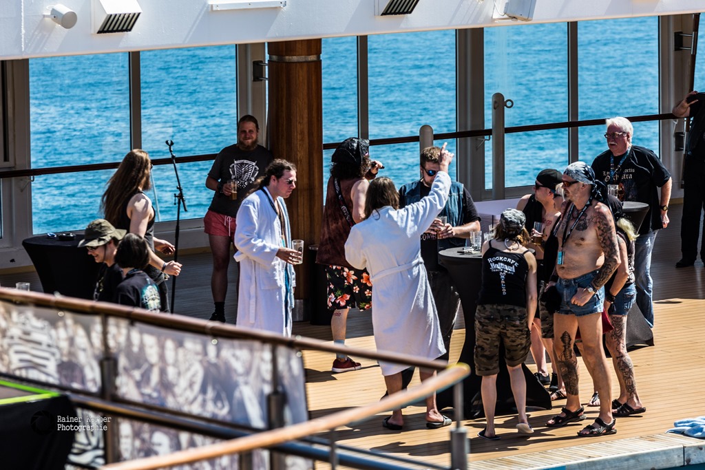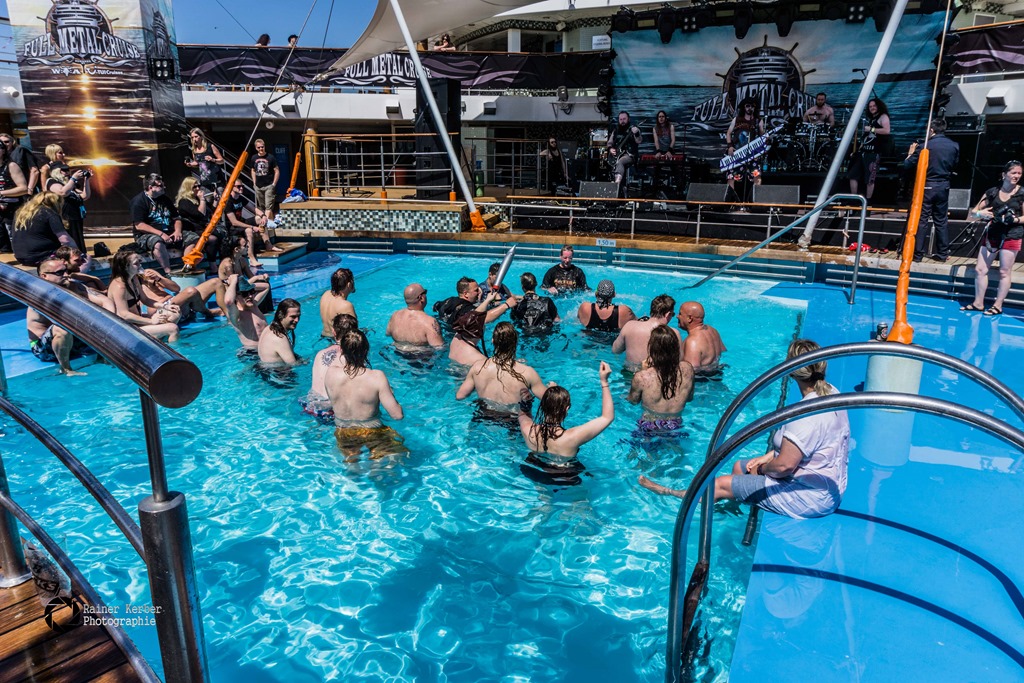 Show ging Sänger Christopher Bowes mit seiner Keytar zur nächsten Bar und ließ sich ein Bier zapfen. Und Gitarrist Daniel Evans spielte auf der Empore in der Mitte des Pooldecks. Nach der Show gingen dann alle Freibeuter im Pool baden.