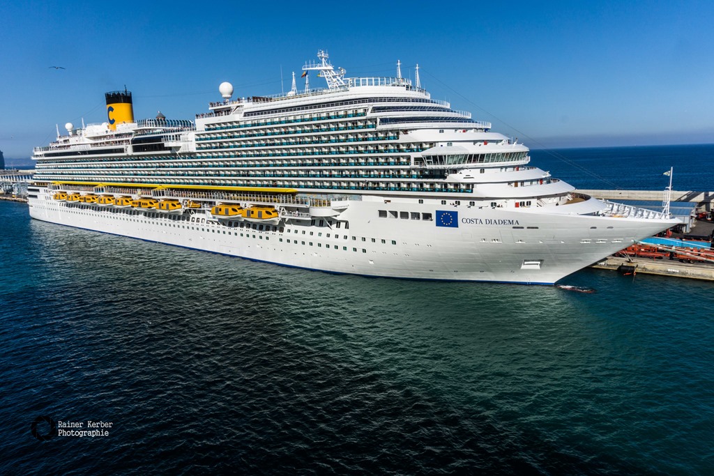 startete die Fahrt Richtung Ibiza. Begleitet von einem Schwarm Möwen, die sich heißhungrig auf die angebotenen Pommes stürzten. Die fraßen einem im wahrsten Sinne des Wortes aus der Hand. Vorbei an einem weiteren Kreuzfahrer, der Costa Diadema ging’s in’s offene Meer.