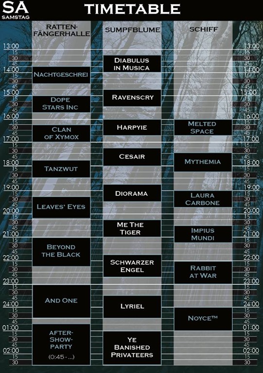 Dieses Festival wartet mit einem ganz besonderen Konzept auf, neben den Konzerten auf drei überdachten und einigen Outdoor-Bühnen gibt es einen großen Mystic Helloween Market auf den Freiflächen rund um die Rattenfängerhalle, in der sich auch die große Bühne befindet. Bis zu 2600 Fans können hier hochwertige Live-Shows verfolgen. Die Sumpfblume, als etwas kleinere Location fasst bis zu 700 Zuschauer. Und dann kann man noch zu Live-Musik über die Weser schippern, mit der “Hameln”, auf der bis zu 200 Besucher Platz haben.