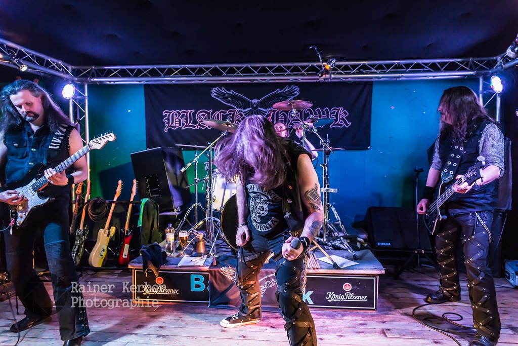 Black Hawk wurden 1981 in der Till-Eulenspiegel-Stadt Mölln vor den Toren Hamburgs gegründet. In den ersten Jahren produzierte die Band mehrere Demos. Es dauerte dann einige Jahre, bis 1989 mit “First Attack” ihr Debüt (als Mini-LP) erschien. Ab 2005 wurden dann fünf Alben veröffentlicht. Musikalisch orientieren sich Black Hawk am Heavy Metal der 80er Jahre und somit an Bands wie Judas Priest, Saxon oder auch Accept. Und genau dieser Sound wurde auch auf den aktuellen Silberling gepresst. Album Nummer sechs, “The End Of The World” wurde standesgemäß mit einer Release-Party in der kleinen Musik-Kneipe BaRRock in der Hamburger City Nord gefeiert.