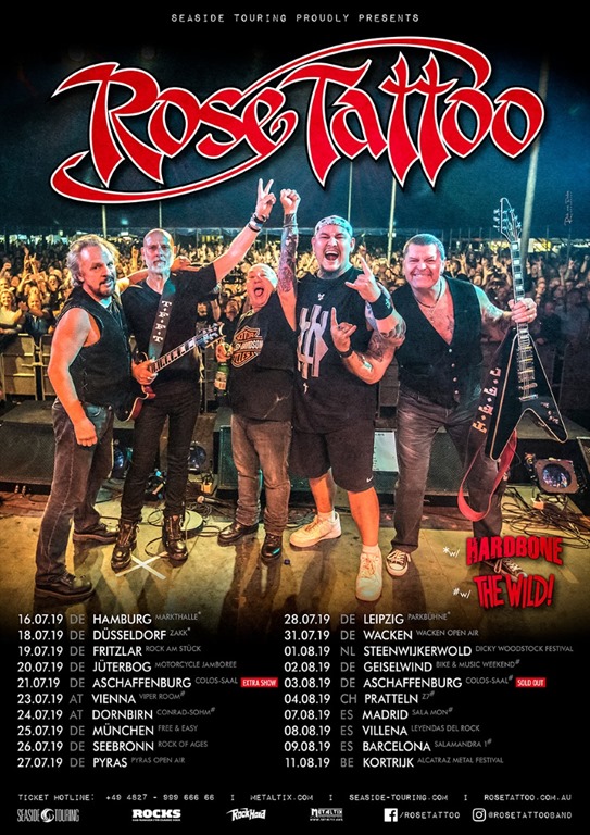 Auch für den Sommer 2019 haben Rose Tattoo eine Europa-Tournee angekündigt. Und es gibt etwas zu feiern. Vor einundvierzig Jahren erschien das selbstbetitelte Debüt Album der Band von Down Under, auch bekannt unter dem Namen “Rock n Roll Outlaw” oder auch “Rock n Roll Outlaws”. Zusätzlich zu den Auftritten in diversen Clubs in Deutschland, Österreich, der Schweiz, Spanien, Belgien und den Niederlanden sind die Australier auch auf dem heiligen Acker von Wacken zu sehen. Als besonderes Geschenk für die Fans, wird bei diesen Auftritten das komplette Debüt Album gespielt. Als Support sind entweder die Hamburger Band Hardbone* oder die Kanadier von The Wild# mit auf Tour.